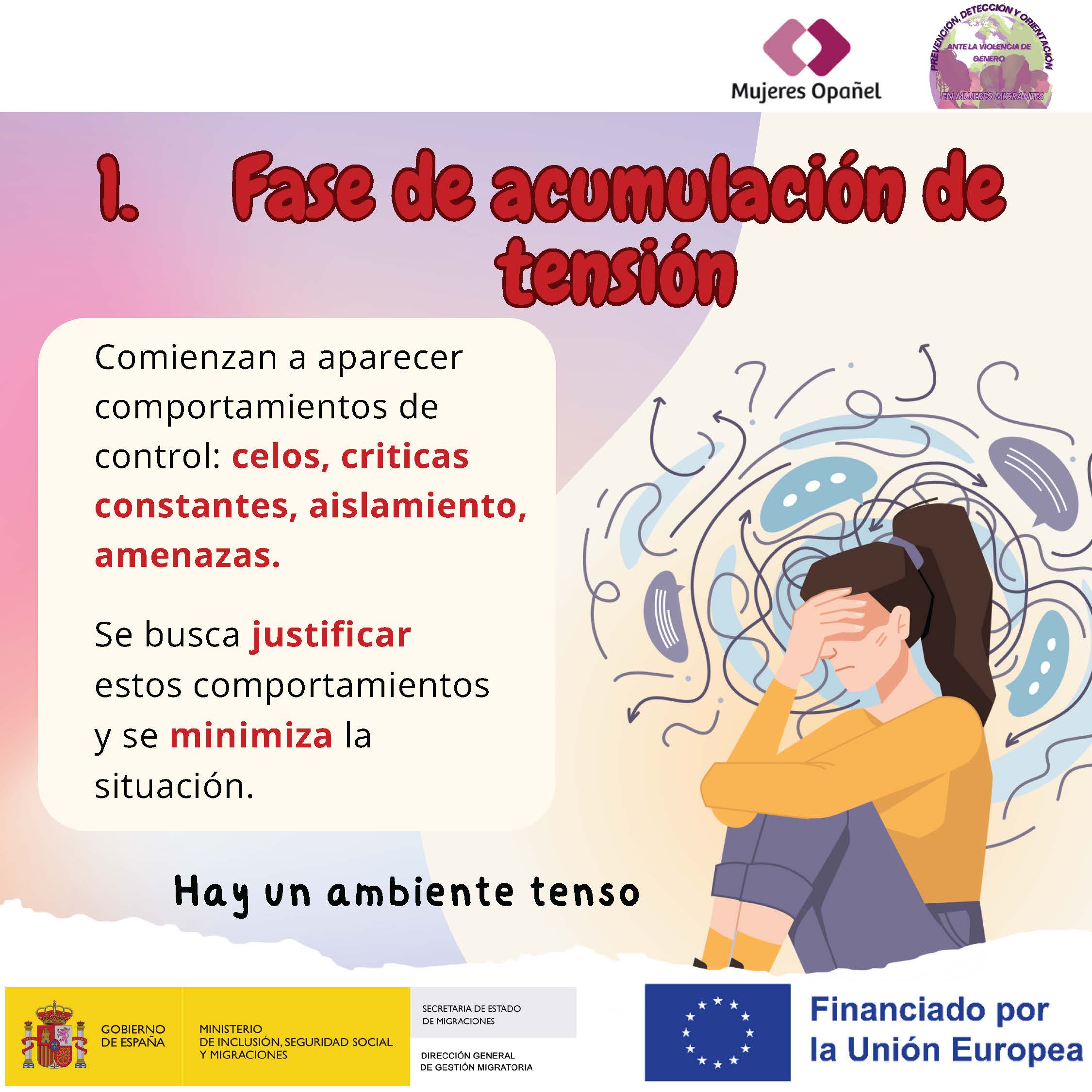⏳ Tensión: todo comienza con una acumulación de tensiones, pequeñas discusiones, celos, control o silencios que generan miedo. La víctima empieza a cambiar su comportamiento para evitar conflictos.