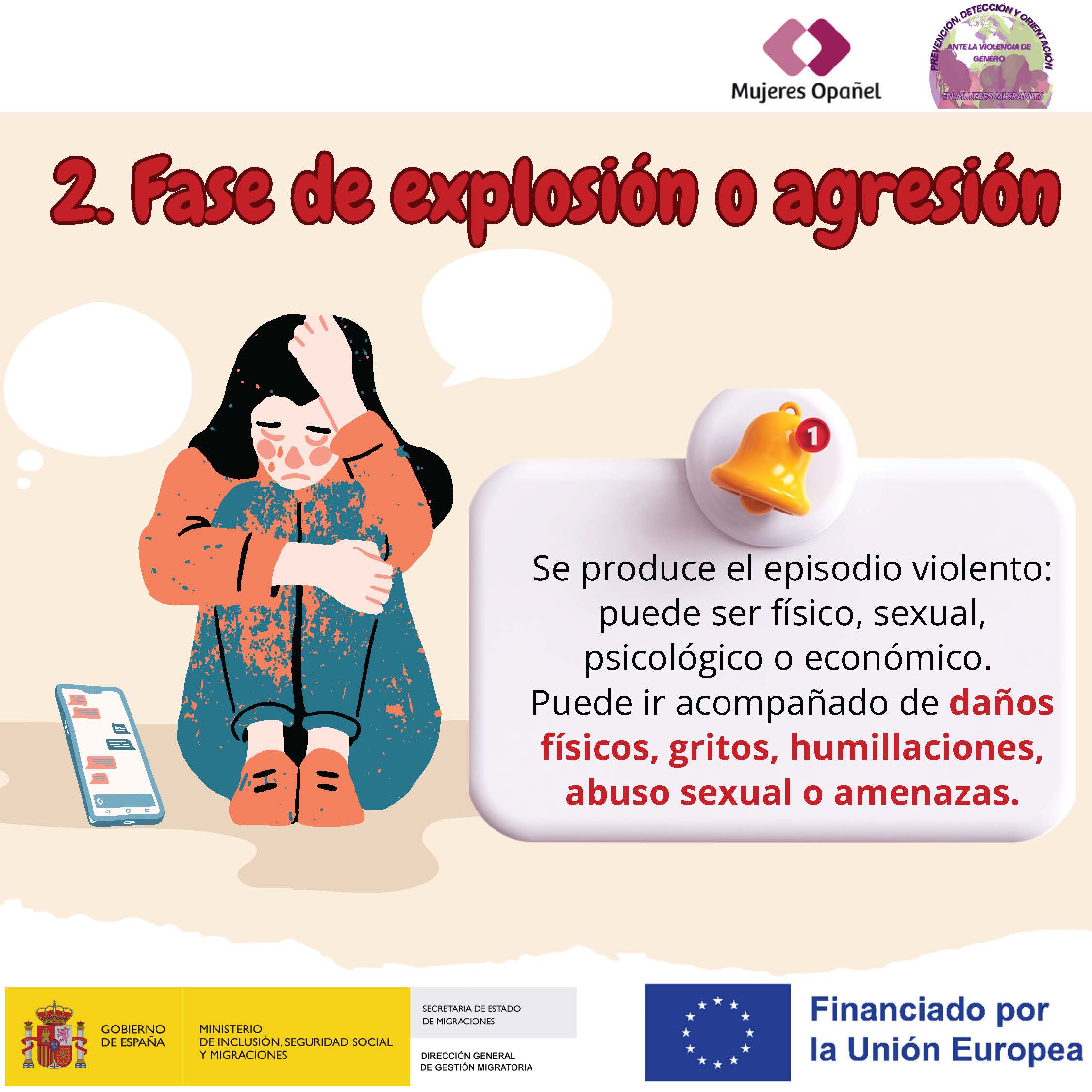 💥 Explosión: la tensión estalla en forma de agresiones verbales, psicológicas, físicas o sexuales. Es el momento de mayor peligro.