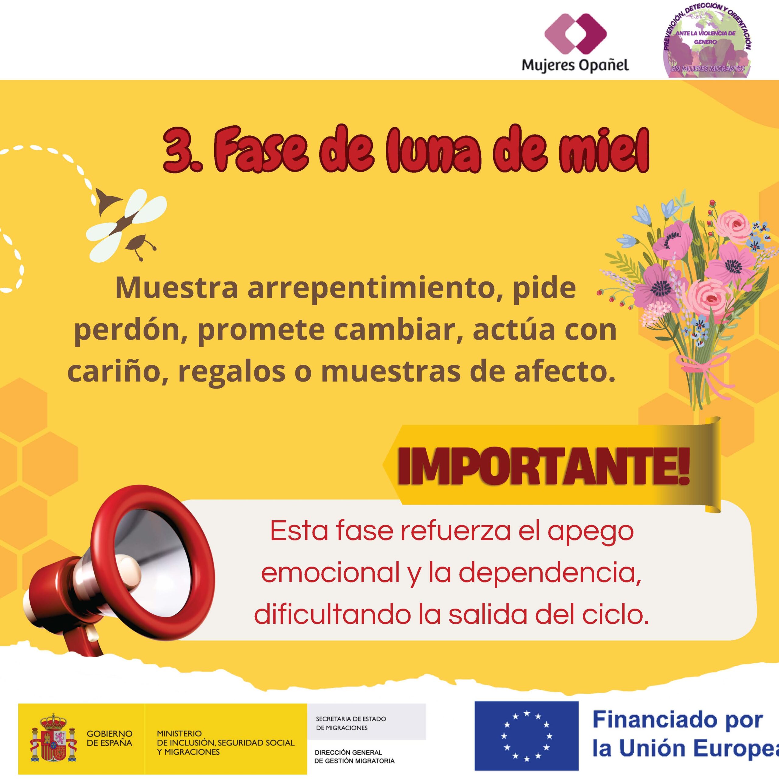 🌙 Luna de miel: tras la agresión, el agresor puede mostrarse arrepentido, pedir perdón, prometer cambios y hacer gestos afectivos. La víctima, esperanzada, puede pensar que todo mejorará. Pero el ciclo suele comenzar de nuevo.